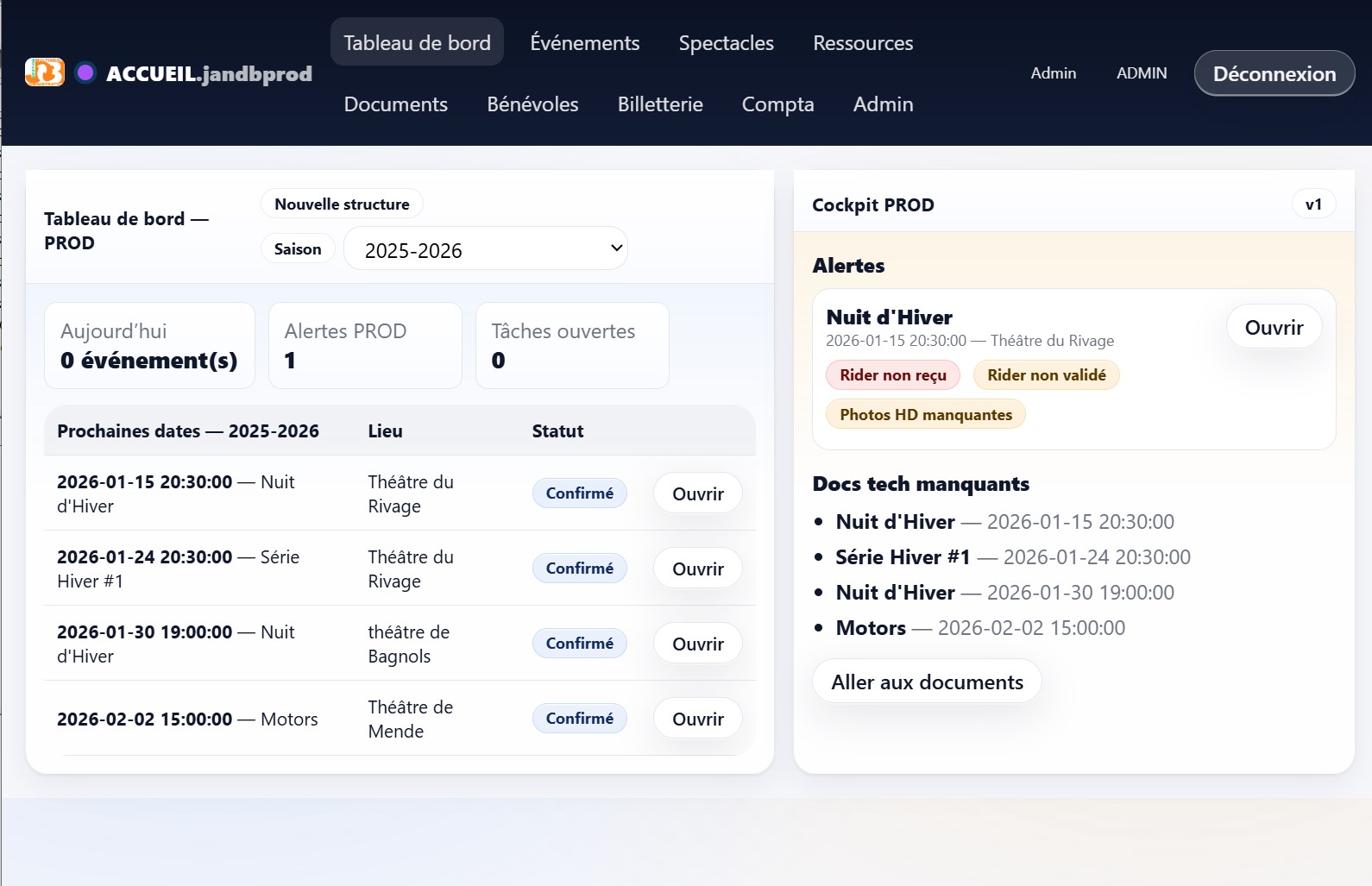 Toutes les informations utiles, à un seul endroit : horaires, représentations, contacts clés, timeline, notes, documents.